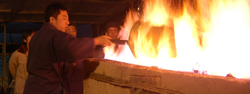 「たたら」の炉も参加者にも大変な2日間の始まりです。ある人はふいごを押し、ある人は砂鉄を投入し、またある人は炭を投入し・・・